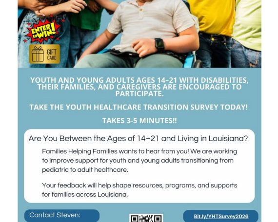 This survey is designed to hear directly from Louisiana youth and young adults, ages 14–21, about how Families Helping Families Centers across the state can better support youth in their healthcare transition and beyond.