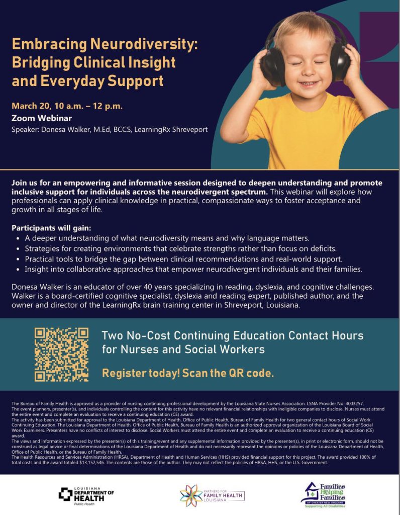 Embracing Neurodiversity: Bridging Clinical Insight and Everyday SupportNicole FloresLatest Events Join Families Helping Families Region 7 & the Louisiana Bureau of Family Health for a FREE virtual workshop: “Embracing Neurodiversity: Bridging Clinical Insight and Everyday Support” Register